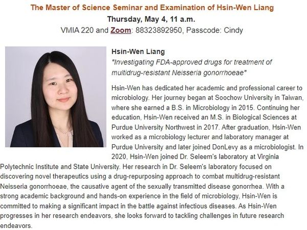 Congratulations to Hsin-Wen Liang (Cindy) who just won the best oral presentation Award at the 32nd Annual Graduate Research Symposium at Virginia Tech. Well done Cindy!